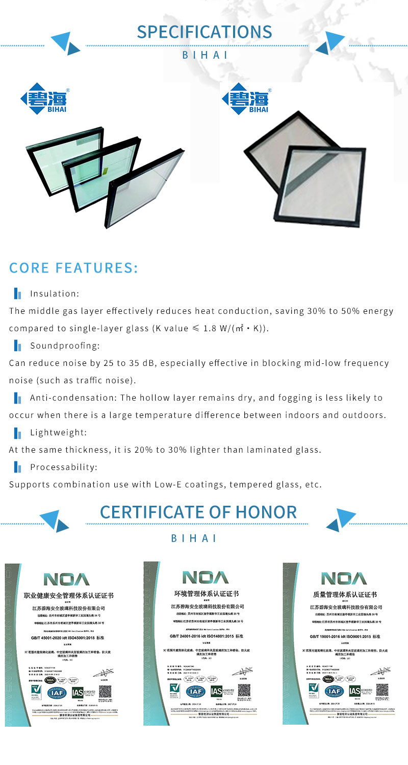 Aislamiento acústico eficaz (la cavidad hermética actúa como una barrera acústica, logrando índices STC de 30 a 40 dB para paneles dobles y de 35 a 45 dB para paneles triples, lo que reduce el ruido del tráfico, industrial y urbano a niveles confortables, ideales para entornos ruidosos). Prevención de condensación (el desecante en los espaciadores mantiene una baja humedad dentro de la cavidad, evitando el empañamiento o la condensación en la superficie interior del vidrio incluso en climas de alta humedad, lo que garantiza una claridad a largo plazo). Adaptabilidad versátil (compatible con varios tipos de vidrio: los recubrimientos Low-E mejoran la eficiencia energética, el vidrio templado aumenta la seguridad, el vidrio laminado agrega aislamiento acústico y anti-rotura; tamaño de espacio personalizable y cantidad de paneles para satisfacer diversas necesidades climáticas y de diseño). Amplia gama de aplicaciones: edificios residenciales (ventanas de dormitorios/sala de estar para comodidad durante todo el año; balcones y terrazas solares de vidrio para retener el calor en invierno y bloquearlo en verano; casas de gran altura para resistencia al viento y aislamiento). Arquitectura comercial (muros cortina de rascacielos para reducir las cargas de HVAC; mamparas de oficinas para aislamiento acústico y luz natural; centros comerciales y hoteles para temperaturas interiores estables y comodidad del cliente). Instalaciones públicas e institucionales (escuelas y hospitales para ahorro de energía y entornos silenciosos; bibliotecas y museos para control de humedad y protección de artefactos; centros de transporte (aeropuertos, estaciones de tren) para fachadas de vidrio de gran tamaño con rendimiento térmico). Escenarios especializados (proyectos de casa pasiva con unidades de triple panel rellenas de argón (valor U <0,8 W/(m²·K)); regiones frías (p. ej., norte de China, Canadá) con vidrio de triple panel de separación gruesa para un aislamiento extremo; áreas costeras con espaciadores resistentes a la corrosión para resistir la niebla salina). Desde el punto de vista medioambiental, reduce las emisiones de carbono entre 0,8 y 1,5 toneladas anuales por cada 100 m² de aplicación (equivalente a plantar entre 5 y 10 árboles); la larga vida útil minimiza el desperdicio de vidrio; el relleno de gas inerte no es tóxico y es reciclable; fabricado en instalaciones con certificación ISO 14001 con procesos energéticamente eficientes, alineados con LEED, BREEAM y los estándares globales de construcción sustentable. La calidad está certificada por ISO 10292 (rendimiento del vidrio aislante), ASTM E1863/E1996 (pruebas térmicas y de hermeticidad) y EN 1279 (normas europeas de vidrio aislante); Las pruebas internas confirman una fuga de gas anual de <1 % (para unidades llenas de gas inerte), sin condensación después de 1000 horas de pruebas de humedad y una durabilidad del sello durante más de 10 000 horas de ciclos térmicos. El vidrio aislante es más que un producto de vidrio: es una piedra angular de la arquitectura sustentable, que equilibra la eficiencia energética, la comodidad y la practicidad. A medida que se intensifica el enfoque global en la neutralidad de carbono, ésta sigue siendo una opción fundamental para los edificios ecológicos, que se adaptan a diversos climas y demandas de diseño en los sectores residencial, comercial y público.